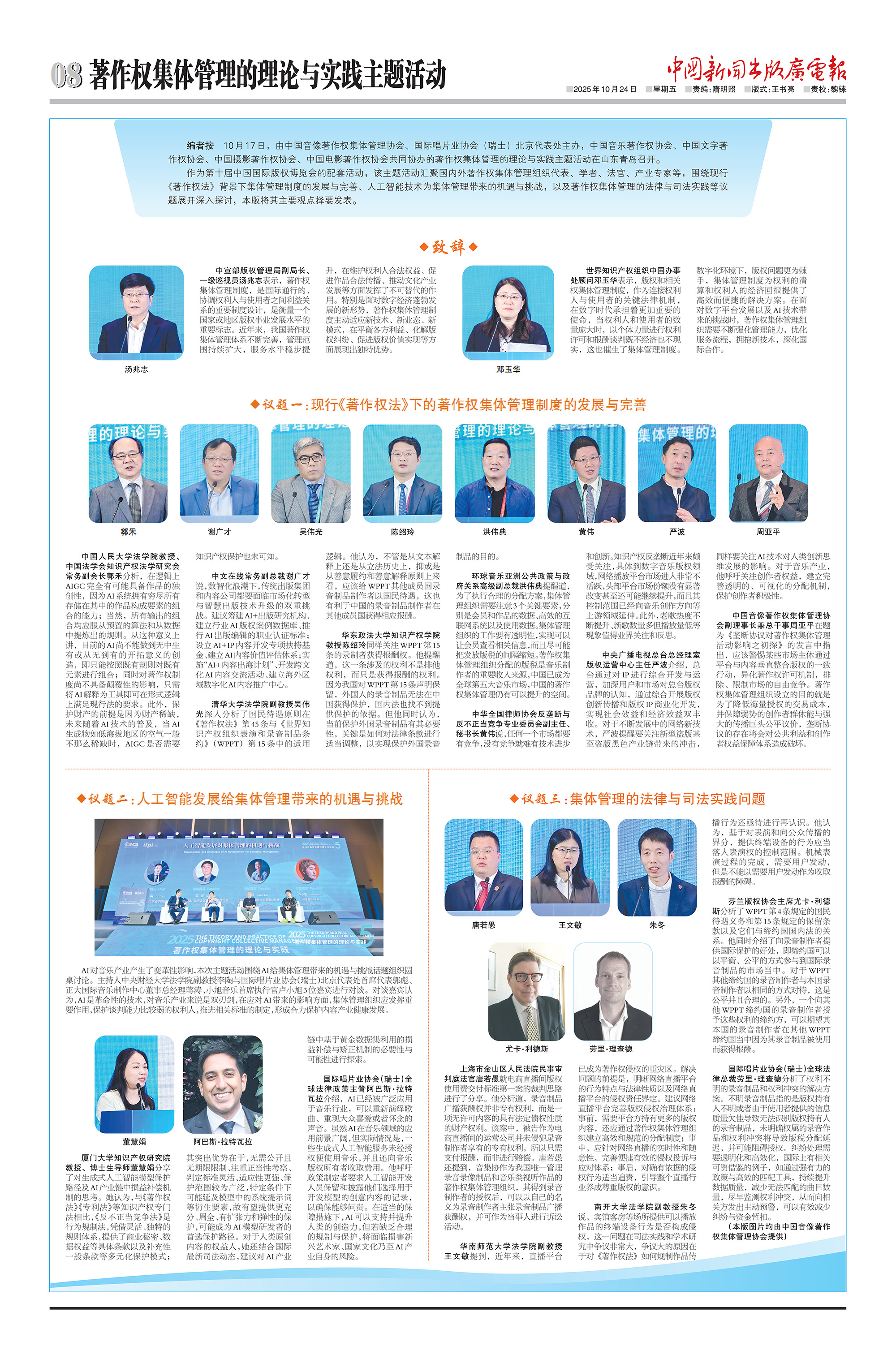 作为第十届中国国际版权博览会的配套活动,该主题活动汇聚国内外著作权集体管理组织代表、学者、法官、产业专家等,围绕现行《著作权法》背景下集体管理制度的发展与完善、人工智能技术为集体管理带来的机遇与挑战,以及著作权集体管理的法律与司法实践等议题展开深入探讨,本版将其主要观点择要发表。