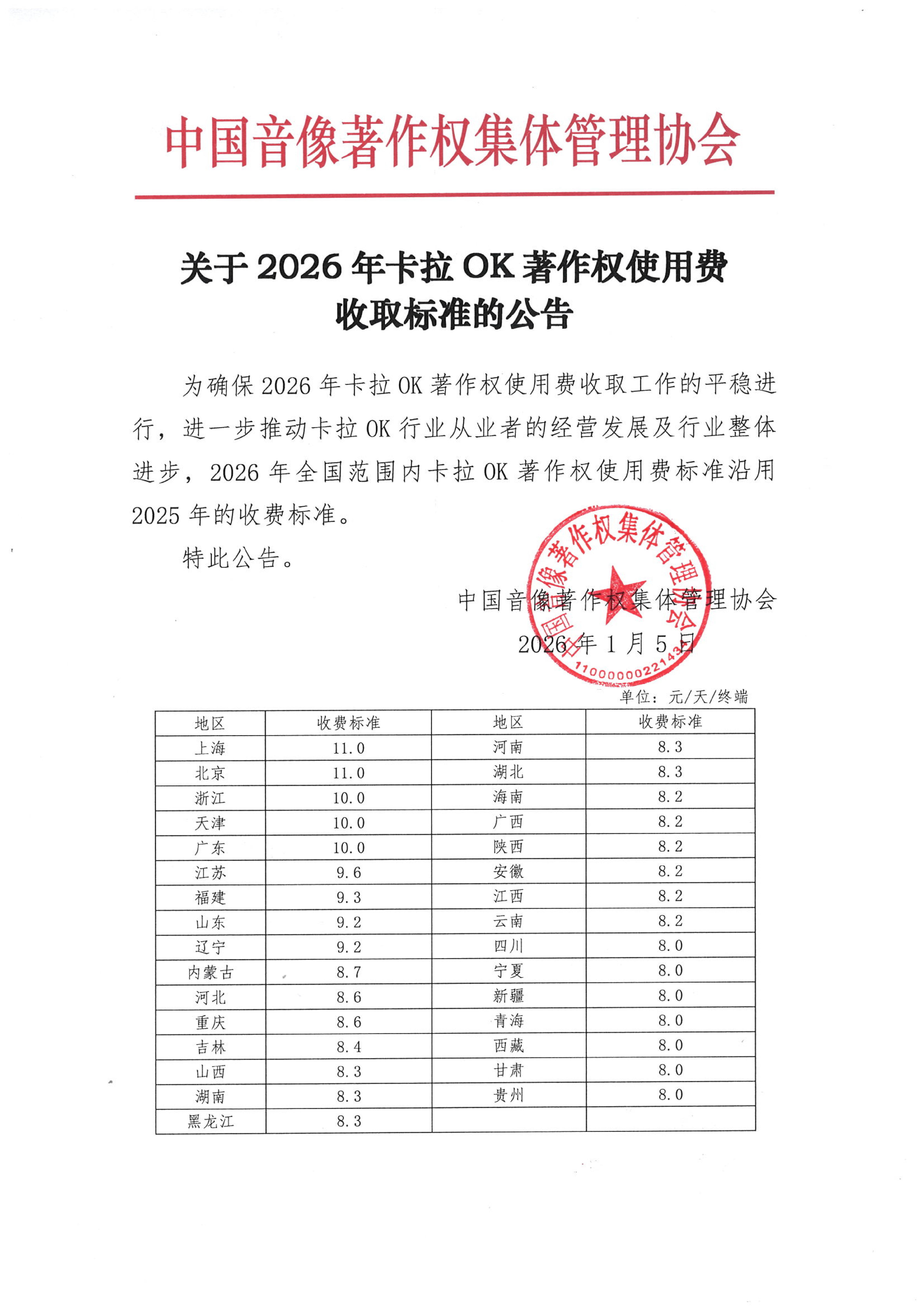 关于2026年卡拉OK著作权使用费收取标准的公告