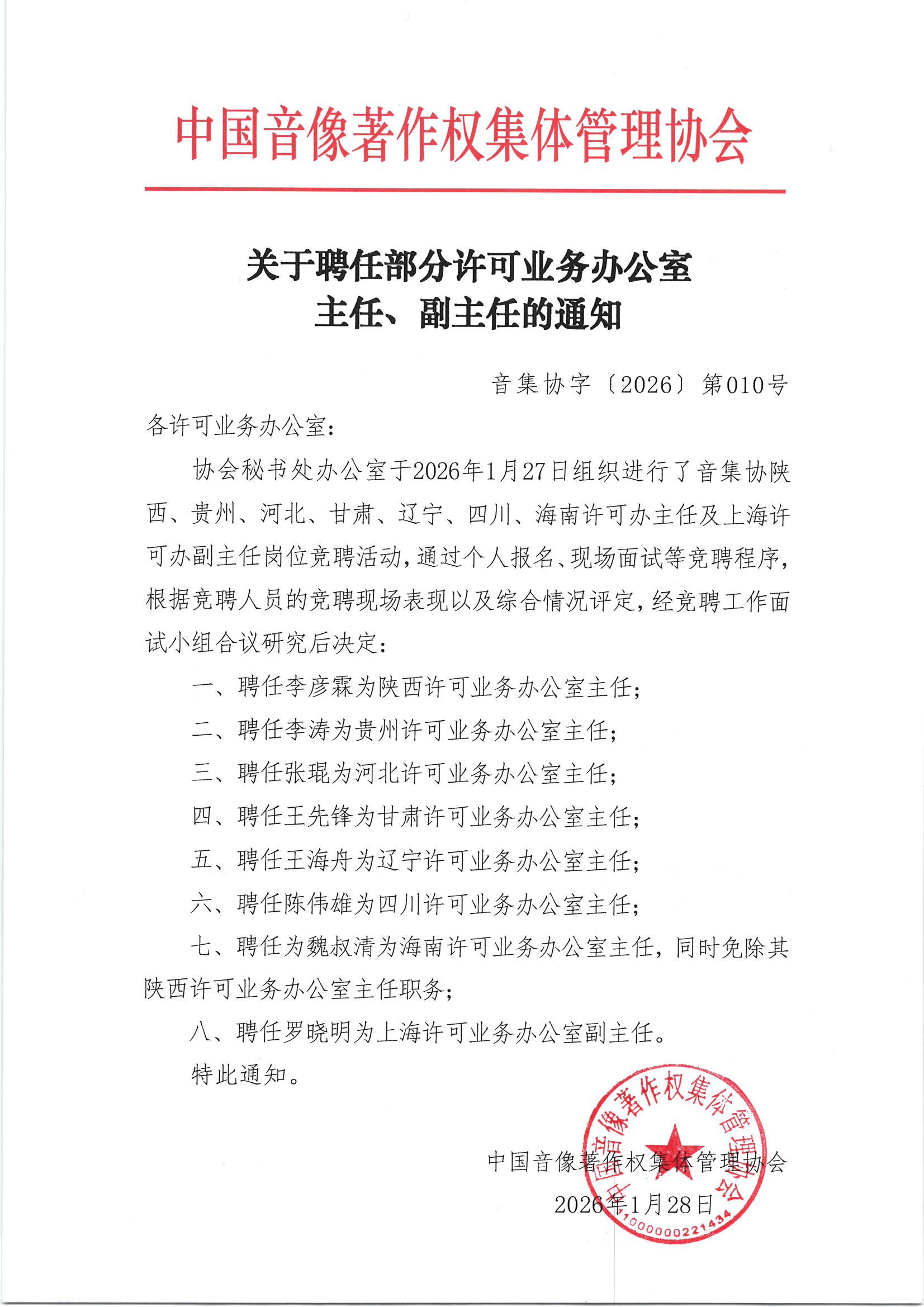 关于聘任部分许可业务办公室主任、副主任的通知(陕西、贵州、河北、甘肃、辽宁、四川、海南、上海)